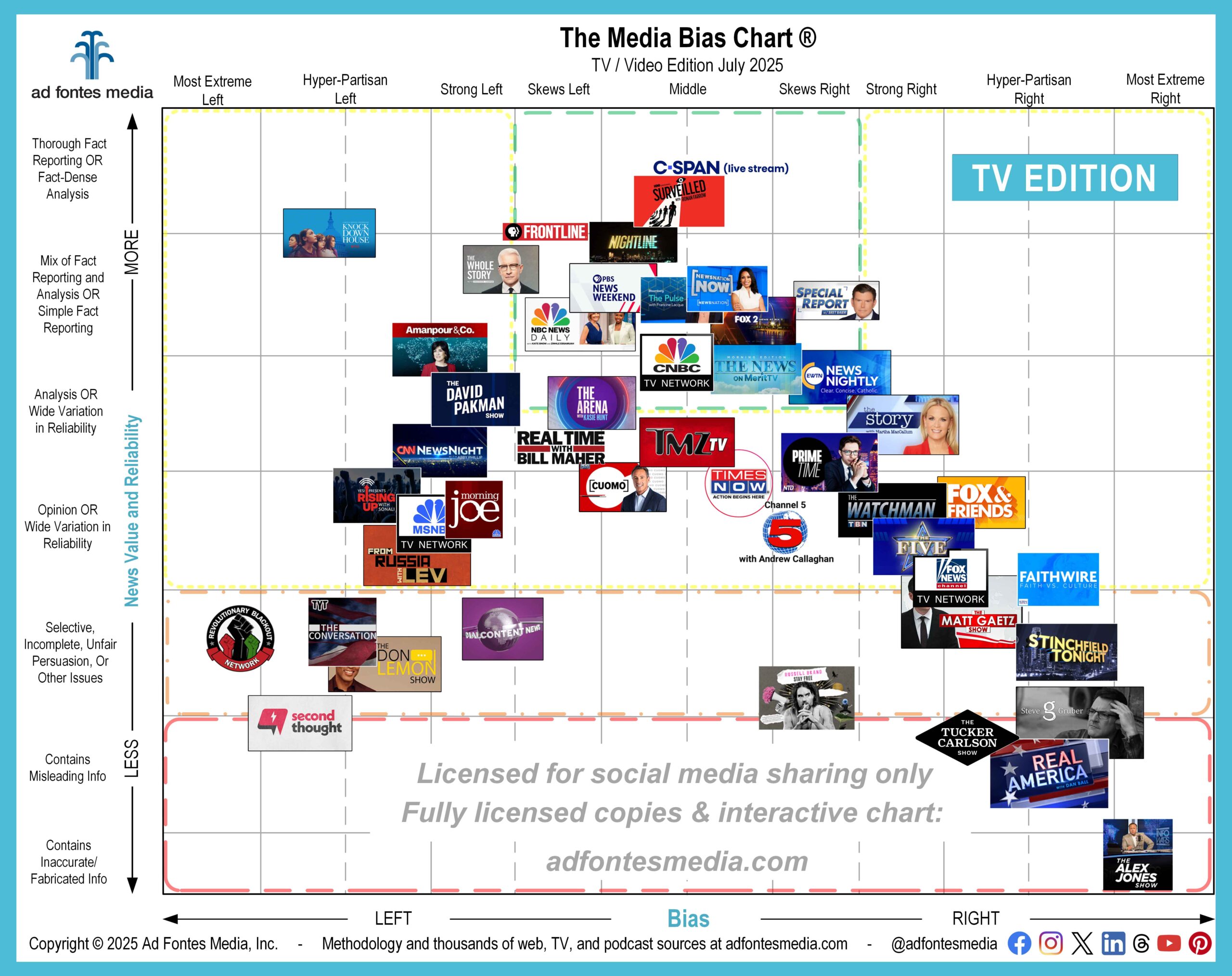 High-reliability sources often have low bias, but there are exceptions. July Media Bias Chart for TV/video features 47 sources