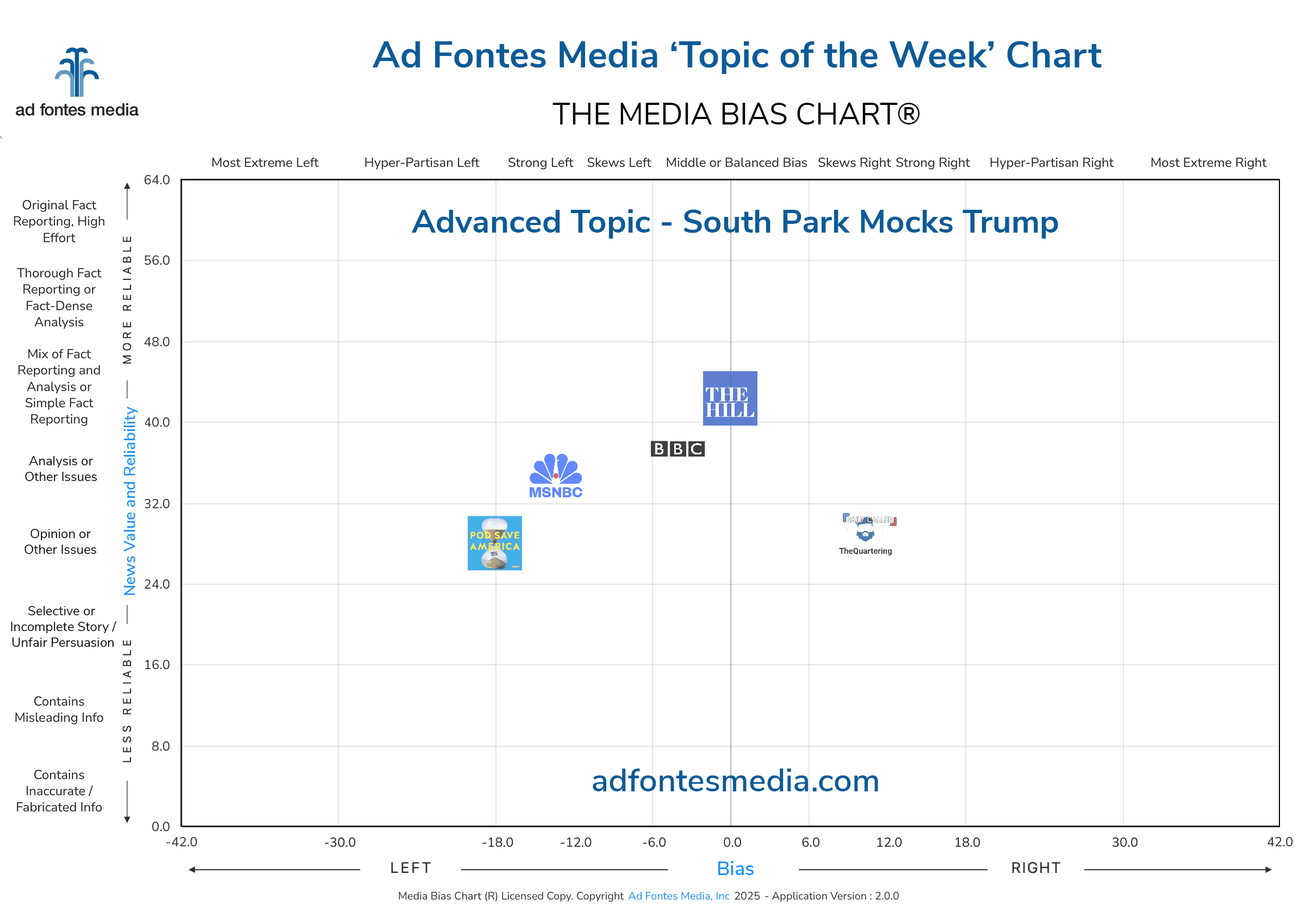 The Hill and BBC provided the most balanced coverage from among our content set. The Hill reports the basic facts about the episode and Paramount’s recent dealings with the Trump administration. The article was categorized as “simple fact reporting.” BBC features comments from the creators of “South Park” at Comic-Con International in San Diego, as well as reaction from the White House and others. It was placed into the category of “analysis.”
